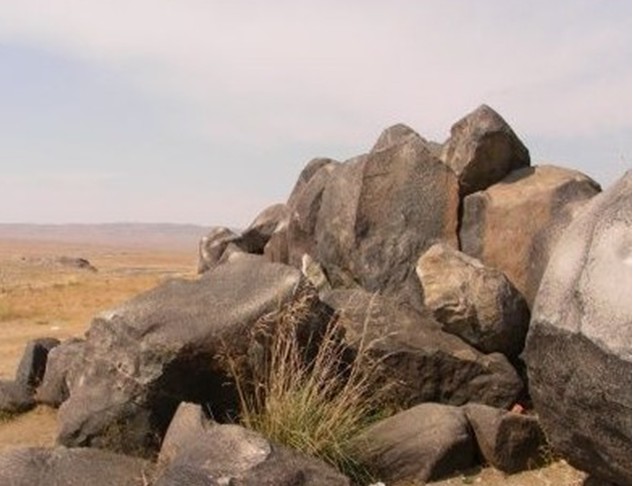 隕石散落堆積在東西長約40米,南北長約110米的戈壁灘上,最大一個(gè)隕石堆,高約3米,約百余塊,石塊呈灰黑色,質(zhì)地堅(jiān)密,棱角平滑,最大的一塊長度達(dá)2.5米。著名的卡擔(dān)塔什石人墓就位于隕石群堆西面約400米處,墓穴四周用黑石一圈圍護(hù),墓邊兩塊高約1 米的黑石上分別刻有一男一女的人像,版權(quán)所有山東聊城聊之旅國際旅行社有限公司,轉(zhuǎn)載必究!據(jù)推測這是墓主人的遺像。女主人頭帶著頭巾,圓形臉,酷似現(xiàn)在游牧民族蒙古族婦女。從石料的顏色和質(zhì)地推測,石像就是從隕石堆中搬運(yùn)來的隕石體雕刻成的。 該黑色巖石巖性致密,其中有些石塊中空,用石擊之能發(fā)出鐘磬般響聲。