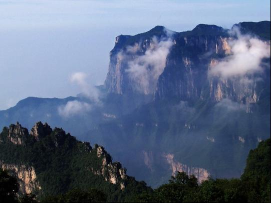 山之東崖俗稱(chēng)天柱關(guān),由高低錯(cuò)落的五六十個(gè)山峰組成,大者峰頂可跑馬,小者狀如筆尖聳立,有“駝鳥(niǎo)峰”、“一柱峰”、“仙女峰”、“天官賜福峰”、“龍泉寶劍峰”、“蓮花峰”等等。山南部千仞峭壁,如巨斧削成,自古就被形容為“千峰爭(zhēng)攢聚,萬(wàn)壑絕凌厲”。北部危巖相迭、青蓮秀出,群峰連綿,仰俯之間,只見(jiàn)怪石嶙峋,濃綠淺翠,流泉飛瀑。