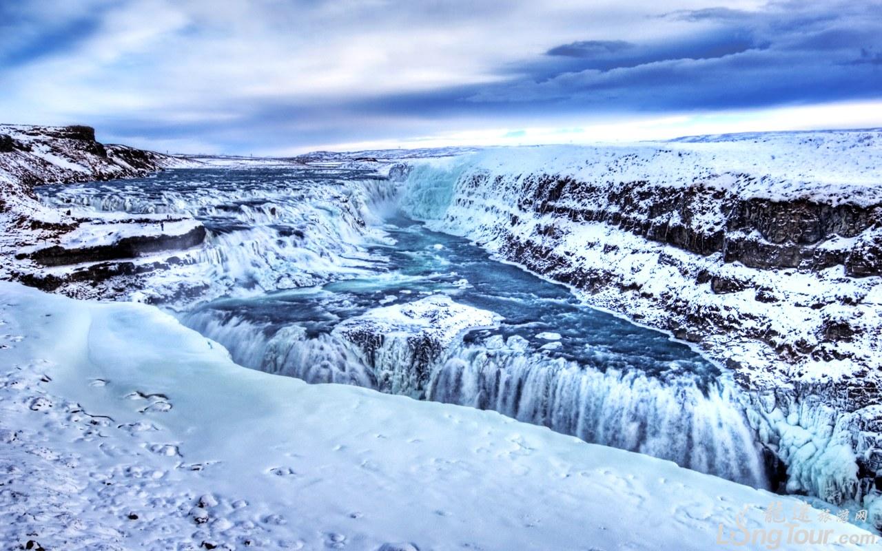 下車時(shí)只隱隱聽到水聲。等走到高坡的盡頭,才發(fā)現(xiàn)自己站在懸崖邊上,下面不是峽谷的瀑布。那奔流的瀑布,呈梯級分布,沒有很高的落差,最高只有11米,但它有幾十米寬。水聲轟鳴,峽谷上籠罩著一層薄薄的水霧。因?yàn)槭嵌?,我們看到了連冰島人也少見的景色。往下游傾瀉的瀑布兩側(cè),凍成了晶營透亮的淡藍(lán)色冰柱,恰似一幅幅天然玉雕。由于那冰柱是在流動中形成的,極富動感,層次鮮明。