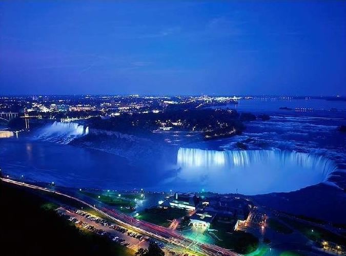 尼亞加拉瀑布在白天看波瀾壯闊,入夜后則是另一番景象。在紅日西墜時(shí),珠幔般的水花,在夕陽(yáng)映照下,七彩虹霓,燦然入目。當(dāng)夜幕降臨之際,瀑布水色漸顯灰黯,此時(shí)圍繞著瀑布周圍的巨型聚光燈,突然齊放綠光,使原已灰黯的瀑布,頓時(shí)大放光彩,變得晶瑩透澈,熠熠生輝。尤其從塔頂望出去,到處是五顏六色的燈光,瀑布的景象比白天更加多姿多彩。在夏季的每個(gè)星期五,尼亞加拉瀑布上空還有焰火表演。