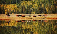 鴨澤湖位于禾木喀納斯蒙古族鄉(xiāng)境內(nèi)喀納斯村南邊,它是由喀納斯河改道后廢棄河段——牛軛湖洼地組成,呈長形蝶狀,沿洼地南端形成一個(gè)南北走向的寬淺湖泊,形似蝶狀的一弘碧水與沼澤濕地連為一體,面積約1.3 平方公里。
