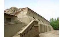 吉木薩爾千佛洞坐落在天山北麓距吉木薩爾縣城西南5km的黃土崗上,向北有小路與烏奇公路相通,交通便利.千佛洞建筑呈東西向的長方形,東面有山門。正殿坐西朝東,土木結構,南北兩則建有配房,磚木建筑。正殿為一有斗拱的硬山頂建筑,分前、中、后堂三部分。前堂塑有丈許高的釋加佛像一尊,中堂面闊三間,繪有佛說法圖,18羅漢等塑像;后堂塑有臥佛一尊;三部分緊密相連,構成一個整體。