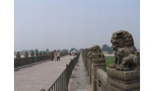 盧溝橋(Lugou Bridge)亦作蘆溝橋,在北京市西南約15千米處豐臺區(qū)永定河上。因橫跨盧溝河(即永定河)而得名,是北京市現(xiàn)存最古老的石造聯(lián)拱橋。盧溝橋全長266.5米,寬7.5米,最寬處可達(dá)9.3米。有橋墩十座,共11個橋孔,整個橋身都是石體結(jié)構(gòu),關(guān)鍵部位均有銀錠鐵榫連接,為華北最長的古代石橋。