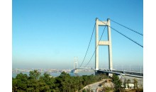 江陰長(zhǎng)江公路大橋,位于江蘇省江陰市黃田港以東3200米的西山,主跨1385米(328+1385+295),橋塔高190米,為兩根鋼筋混凝土空心塔柱與三道橫梁組成的門(mén)式框架結(jié)構(gòu),重力式錨碇,主梁采用流線(xiàn)型箱梁斷面,鋼箱梁全寬36.9米,梁高3米,橋面寬29.5米,雙向六車(chē)道,兩側(cè)各設(shè)寬1.8米的風(fēng)嘴,1999年建成。
