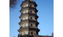 七級浮屠塔 高約37米,布局為國內(nèi)罕見,正面朝南,緊連磚建硬山式地藏殿。殿前接三間卷棚敞廳,東西兩側(cè)各設兩層塔式鐘鼓樓。塔東、南、西三面和北面三層以上開窗,余皆在外設拱形佛龕,塑以生動的羅漢浮雕31尊。殿塔相通,供奉三大佛、四菩薩七尊銅像。 塔內(nèi)有木梯,可供登臨觀賞。殿和塔檐下的雀替做成龍、鳳、獅、鶴等浮雕,造型生動。塔的局部構(gòu)件和裝飾具有西方建筑的風格。