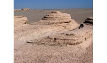 且末古城位于且末縣城西南約6公里的老車爾臣河岸臺(tái)地上,海撥款1,273米,遺址地表無植被,已沙化,呈雅丹地貌。在東西長(zhǎng)約1公里,南北寬200米的范圍內(nèi),地表散布著大量陶片及鐵塊,煉鐵渣,曾采集到數(shù)件磨盤石殘塊,玻璃片,料珠。此外,在遺址中心區(qū)風(fēng)蝕地表,尚殘存數(shù)間房屋及其他建筑遺址,1985年9月挖掘出的古代毛織品,古尸,遍地尸骨墓室,還有陶片弓箭。