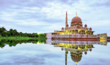 粉紅清真寺(Masjid Putra),仿造摩洛哥卡薩布蘭卡的哈桑清真寺而建,坐落在馬來(lái)西亞的新行政中心——太子城(Putrajaya,官方譯名:布城),占地面積5.5公頃,耗資1000萬(wàn)美元,是馬來(lái)西亞最大的清真寺,同時(shí)也是東南亞地區(qū)最大的水上清真寺。