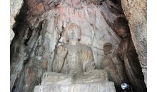 潛溪寺高、寬各九米多,進(jìn)深近七米,大約建于一千三百多年前的唐代初期??唔斣寰疄橐欢錅\刻大蓮花。主佛阿彌陀佛端坐在須彌臺(tái)上,面頤豐滿,胸部隆起,衣紋斜垂座前,身體各部比例勻稱,神情睿智,整個(gè)姿態(tài)給人以靜穆慈祥之感。主佛左側(cè)為大弟子迦葉,右側(cè)為小弟子阿難。兩弟子旁邊分別為觀世音菩薩與大勢(shì)至菩薩。特別是南壁的大勢(shì)至菩薩,造型豐滿敦厚,儀態(tài)文靜,在故宮博物院有1比1的復(fù)制品陳列。阿彌陀佛與兩側(cè)的兩位菩薩共稱為西方三圣,即掌管西方極樂(lè)世界的三位圣人,是佛教凈土宗信仰的對(duì)象